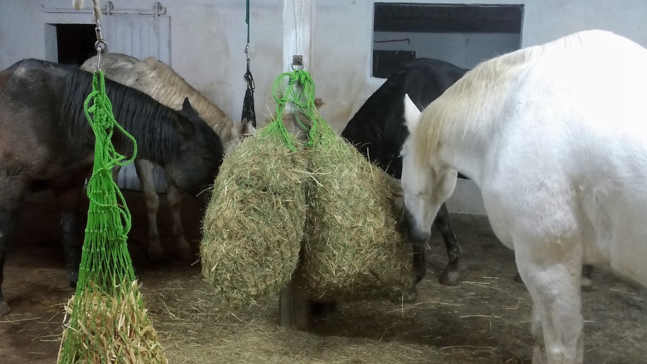 Die Heunetze hängen das erste Mal drinnen. Wenn Pferde nicht mehr raus wollen, dann ist der zur Verfügung stehende Platz sehr beengt. In beiden Stalltrakten hingen Heunetze. Die 4 zogen es aber vor zusammen in einem Stall zu stehen…: