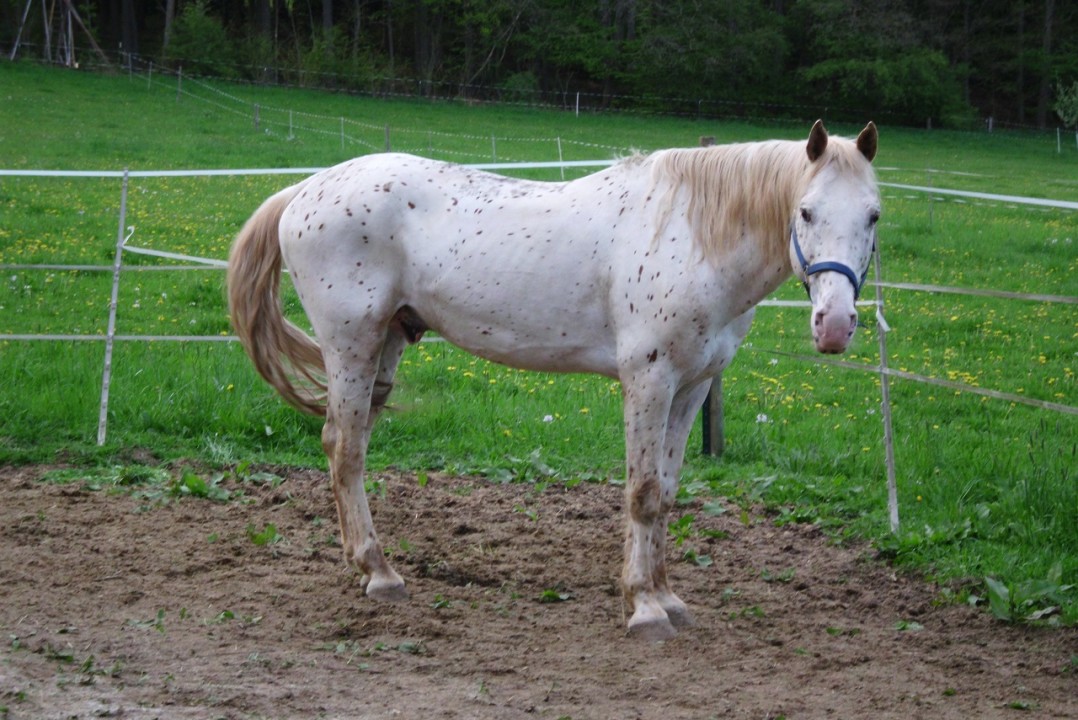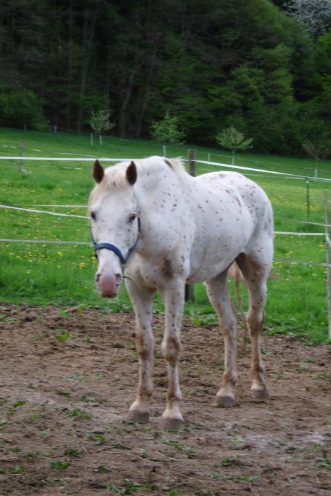 Im Mai 2013 habe ich ein weiteres Pferd gekauft, den Kleinen Onkel. Ein 11-jähriger gerade kastrierter Appaloosa (? oder vielleicht doch ein Knappstrupper…?), der seine letzten 8 Jahre in einer Box verbrachte, die er wahrscheinlich so gut wie nie verlassen durfte. Er war fürchterlich mager, hatte ziemlich deformierte Hufe, war sehr dominant und respektlos, hypernervös und extrem lauffreudig. Er hatte offensichtlich weder Erziehung noch Ausbildung bekommen. Schrecklich, was manchen Tieren angetan wird. Er war eigentlich ein Fall für den Schlachter. Aber ich hatte die Möglichkeiten und wollte es versuchen.