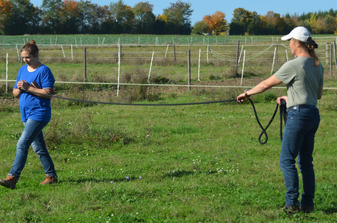 Das und noch vieles mehr waren unsere Themen an diesem Wochenende. Es war sooo schön zu sehen, wie harmonisch die Pferd-Mensch-Paare miteinander waren! Vorbereitet durch Stufe 1 und 2 konnten alle Teilnehmer ihre Pferde bereits vorher allein durch ihre Körpersprache lenken. Das ermöglichte ihnen sich voll auf die Einsatzmöglichkeiten eines Seils(Longe) zu konzentrieren. Bei perfekten äusseren Bedingungen (T-Shirt-Wetter im Oktober!) waren alle sehr entspannt und zufrieden, die Pferde genauso wie die Teilnehmer. 🙂