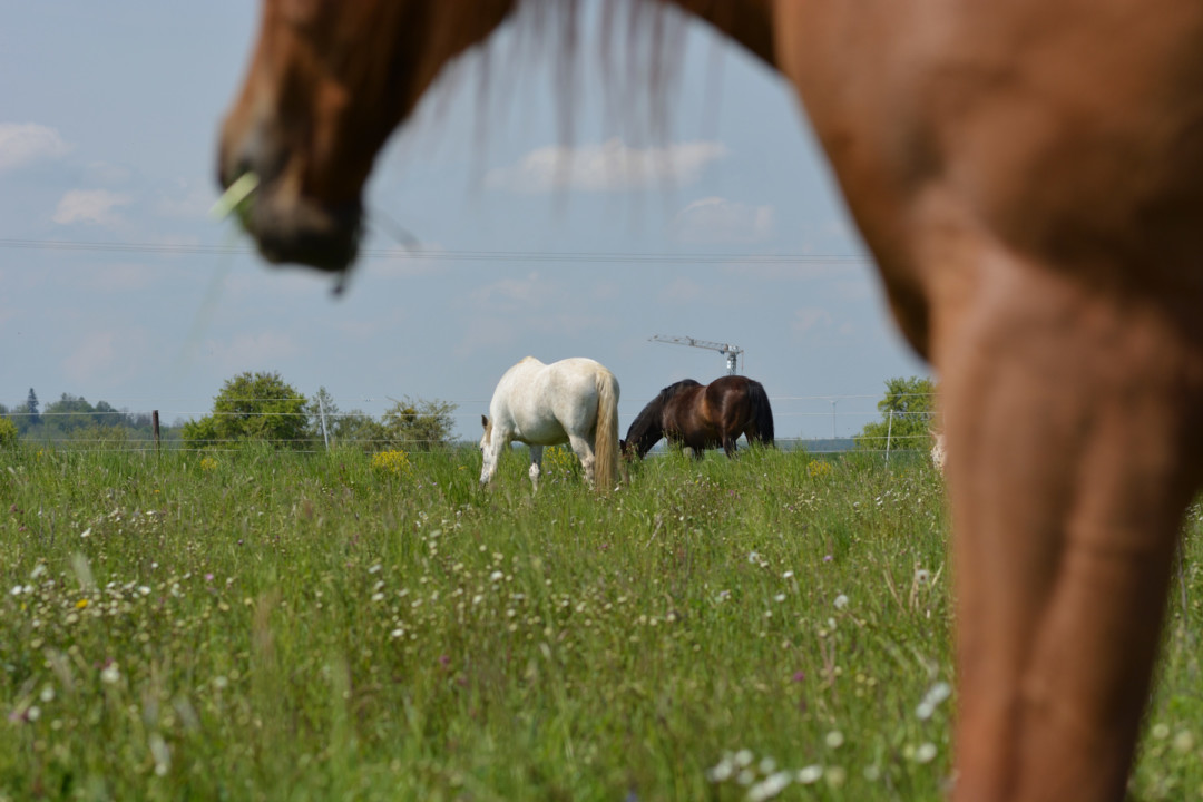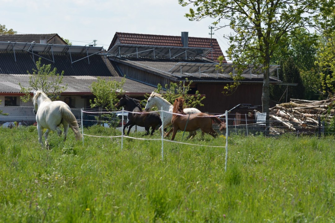 Aufgrund der brisanten Situation beschloss ich keine weiteren Veränderungen vorzunehmen und die Jungs über Nacht auf der Weide eingesperrt zu lassen – damit sie genügend Platz haben um sich ausweichen zu können. Am Abend ging ich noch mal hin um Wasser aufzufüllen und Heu anzubieten. In diesem Moment ging es los: Tio startete einen Riesenangriff auf beide Schimmel – vor meinen Augen. Und holte sich Niňo zurück. Es sah furchterregend aus, aber es ist nichts passiert ausser ein paar kleinere Löcher im Fell der Pferde. Auch psychisch waren sie alle wohlauf – selbst Niňo. Diese fliegenden Wechsel schienen ihm nichts auszumachen…