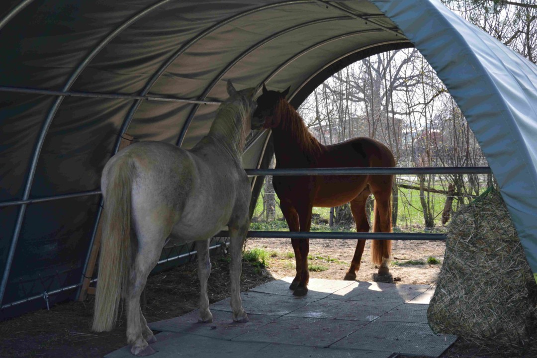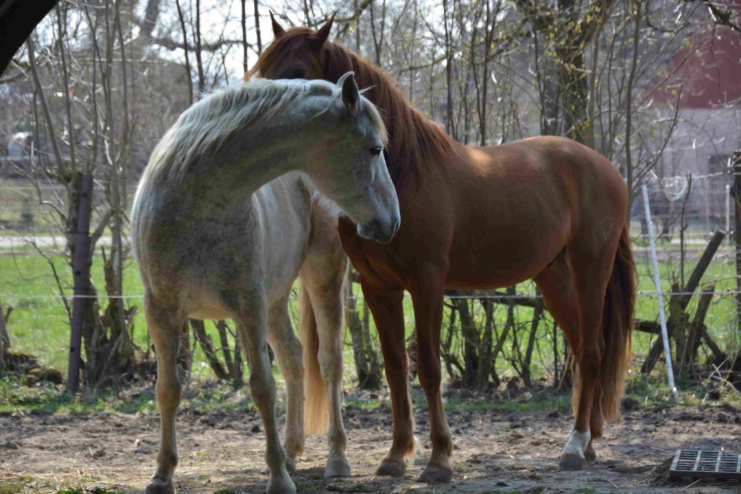 Ca. 3 Stunden waren sie friedlich. Dann wurden sie plötzlich beide wütend, drehten ihre Hinterteile gegeneinander und prügelten aufeinander ein. Santo rannte schlussendlich davon und hielt extrem grossen Abstand. Er war sichtlich verunsichert und sah sehnsüchtig hinunter in seinen Paddock zu den anderen beiden. Ich habe ihn erlöst und abgebrochen…
